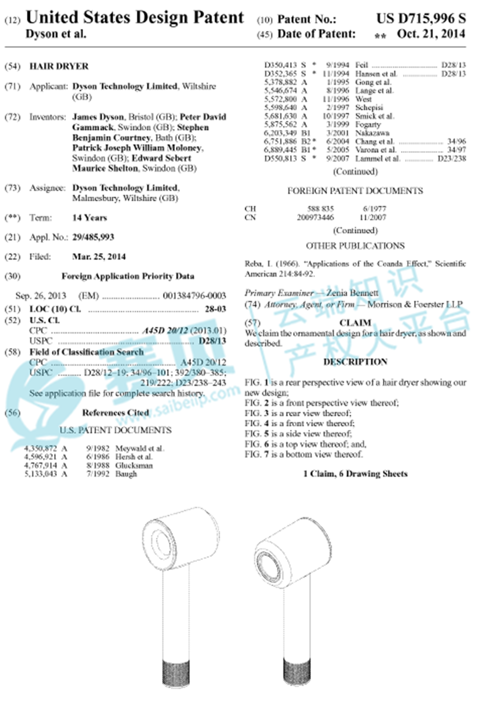 美国外观专利USD715996S1,权利人是Dyson Technology Ltd, 于2014.03.25提交申请,并于2014.10.21获得授权。戴森1991年创立于英国,是世界著名的科技公司,设计、制造和分销护发产品的公司。在世界各地戴森产品已成为高品质的象征,旗下产品十分畅销,其中包含知名的戴森吹风机。