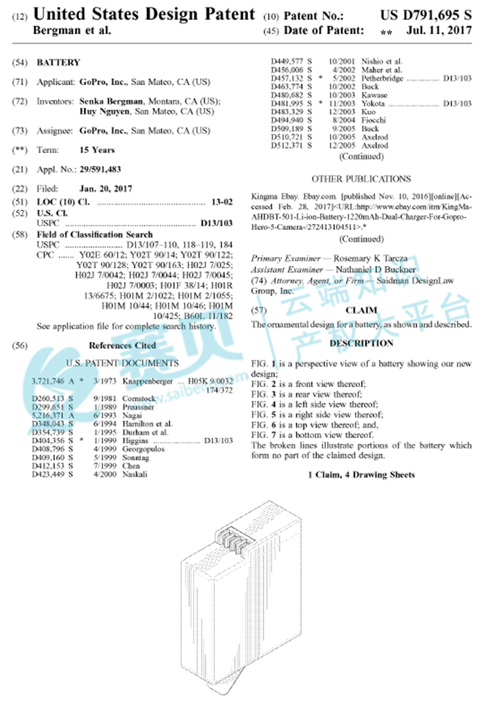 美国外观专利USD791695S1,权利人是GoPro Inc,于2017.01.20提交申请,并于2017.07.11获得授权。GoPro,Inc .是一家2002创立的美国公司,始终致力于打造顶尖的运动相机产品。GoPro不仅是相机和摄像机的创新者,还推出了各种配套设备,如支架和无人机,以满足不同运动拍摄需求。