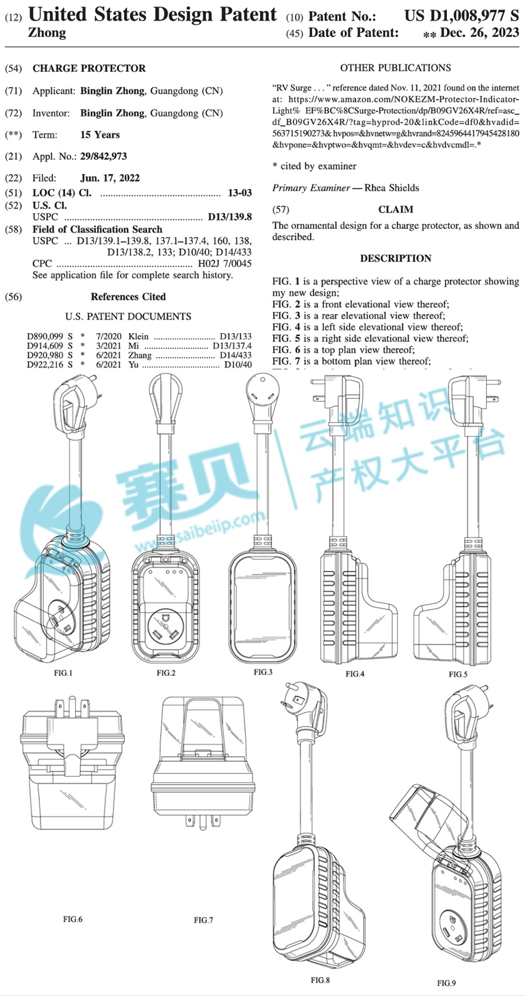 本案涉及一项美国外观设计专利USD1008977S,最早申请日期是2022年6月17日,下证日期是2023年12月26日,在此之后上架的相关外观产品或有侵权风险。