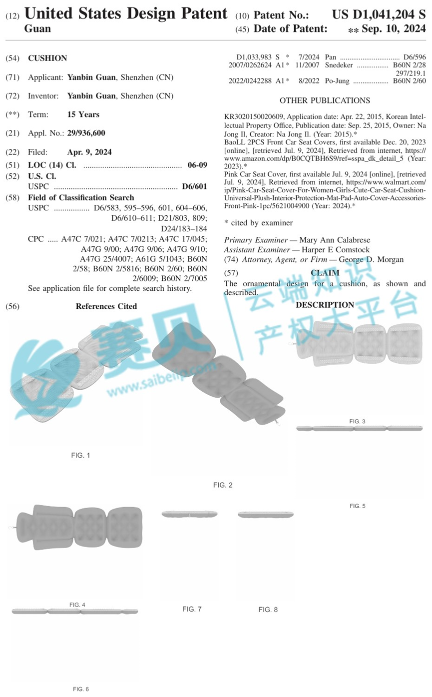 本案涉及一项美国外观设计专利USD1041204S,最早申请日期是2024年4月9日,下证日期是2024年9月10日,在此之后上架的相关外观产品或有侵权风险。