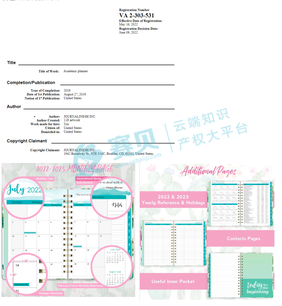 诉讼涉及到的版权是VA2-303-531,根据法院文件中的图片来看,原告应该是为日记本里的三张页面设计图纸注册了版权。