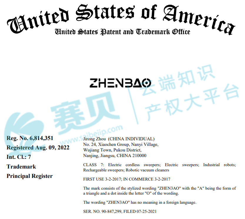 涉案商标是ZHEN3AO,注册大类为第7大类科学仪器,包括电动扫地机、工业机器人、吸尘器等电动机器产品,该商标未经允许不得出现在产品标题、描述上,否则会有侵权风险。